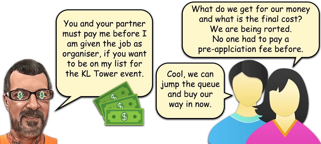 However, Avery already seemed to me to be a bit of a conman. I had lost respect for him after he started asking for money from BASE jumper’s partners before he even officially secured the job of new KL Tower BASE organiser. He had created a list of BASE jumpers that he would invite to KL Tower if he was given the job. All BASE jumpers had to pay a fee to be on this list. Then additionally he asked for a fee from any BASE jumper’s family member that they intended to bring to KL Tower. The fee was due before he flew out to Malaysia for a meeting with the CEO where he was expecting to be officially given the job. Paying Avery a fee never had any bearing on the ability of any BASE jumper’s family to go to KL Tower. It was a con to fund his takeover bid. He could not tell anyone he demanded a fee from the full cost that KL Tower would charge them or exactly what they would be getting for their money. He could not tell BASE jumper’s family if KL Tower would continue with their force marketing extortion practices, forcing them to pay a high fee for things that they did not need or want. Avery seemed to be the perfect person to help the new KL Tower management with their force marketing extortion practices for BASE jumper’s families and personal crew, as he was already extorting them himself.