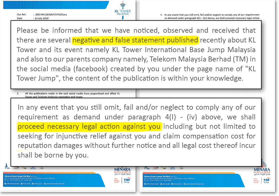 Instead of KL Tower managers rectifying the situation, apologising to Sibu BASE jumpers, and taking appropriate action against their new representative Avery Badenhop if he actually made up the requested ban himself, they chose to send a threatening letter about their intent to take legal action against me. They claimed in the letter that the statements I published on social media about KL Tower BASE jumping events were negative and false. Presumably, this included my publications about past negligence which were a major factor in serious accidents continuing to happen at their event, along with their alleged request to ban Sibu participants. They demanded that I write a public apology to be published for 7 days and then delete my social media site. The letter was signed by brand new KL Tower CEO Datuk Rozlan Mohamed who had no knowledge of previous BASE jumping operations. So he really had no idea about most of the things he was making threats about, other than if he was actually the one who requested the ban of Sibu BASE jump participants.