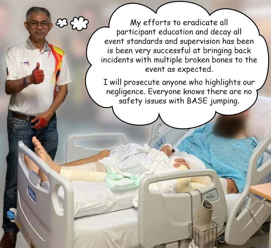 I took his statement as an attempt to try to insult me, suggesting that the vast knowledge I had of all the serious accidents and issues that had happened throughout the history of the event was not real. It also showed great disrespect for those that had paid a high price in bloodshed, broken bones, and even a loss of life, for many of the issues to be learnt about at BASE jumping events organised by KL Tower.
