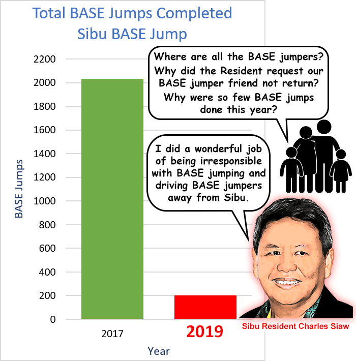 The Sibu Residents’ poor decision-making turned out to be very detrimental to the Sibu event for the second year in a row. Avery first doubled the entry fees for Sibu BASE Jump, driving regular participants away. But then the situation in Malaysia changed for Avery. KL Tower managers decided that they were not going to use outside help anymore, and would just use novice Malaysians to organise their BASE events in future. They gave Avery an offer that was not financially worthwhile for him, so he pulled out of both the KL Tower event and the Sibu event. It was ironic that Avery let the Sibu Resident down, after the Resident had disrespected everyone to strangely support Avery’s and KL Tower manager’s deviousness.