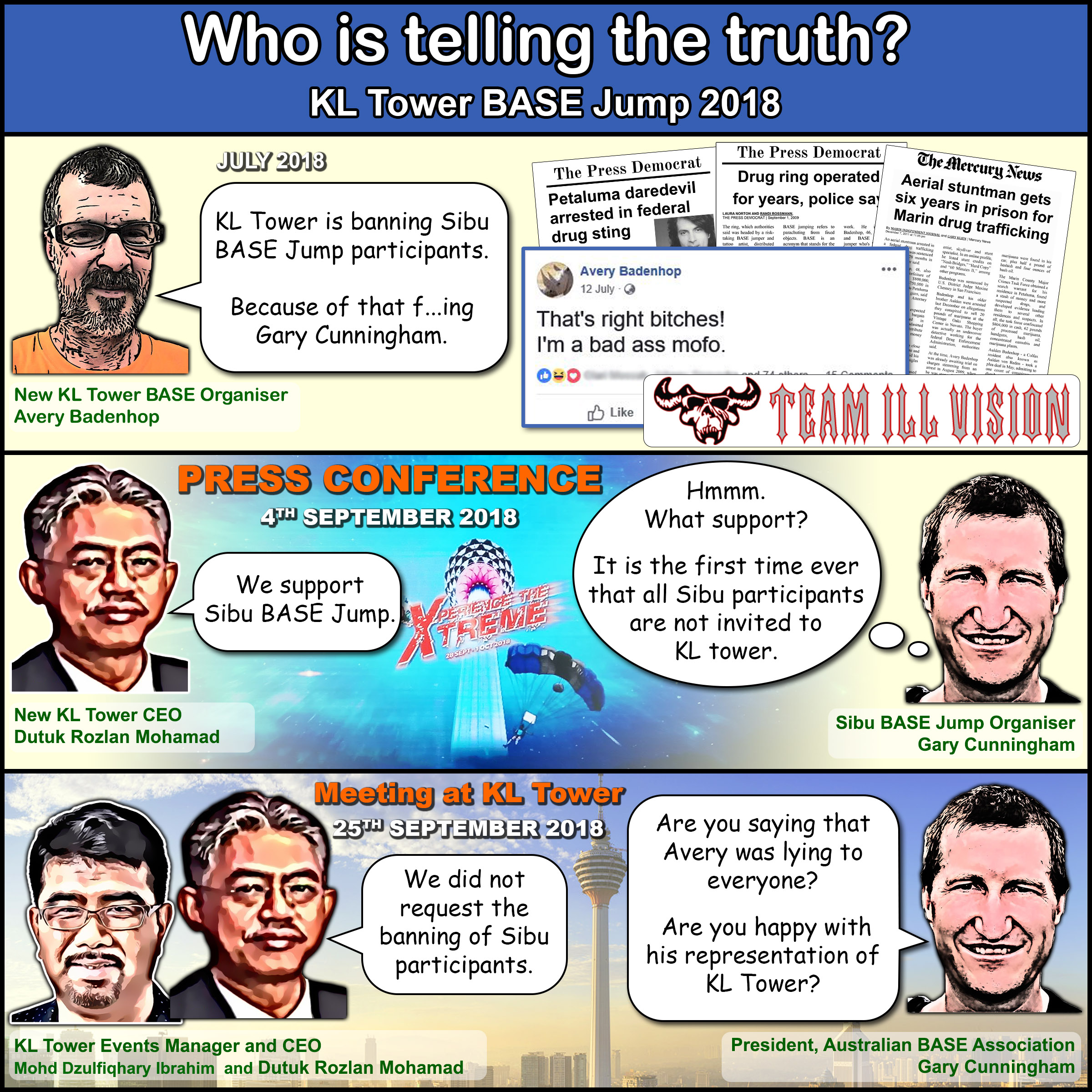 Also at the meeting between KL Tower managers and previous KL Tower BASE Jump organiser Gary Cunningham, it was discussed about KL Tower managers request to ban Sibu participants from the KL Tower event. KL Tower managers were in very strong denial that they made any request to ban Sibu BASE Jump participants. Their new BASE jumping organiser Avery Badenhop had certainly sent around messages to most of the Sibu participants, stating that KL Tower had requested that he ban Sibu participants from the KL Tower BASE jumping event. Avery told some Sibu participants that he had refused to go ahead with the ban, but warned them to keep low-key at KL Tower and not to wear Sibu T-shirts at KL Tower. Other Sibu participants were told they would not be banned but it would be looked on negatively (or words to that effect) if they went to Sibu. And some Sibu BASE jump participants were outright banned from KL Tower BASE Jump, being given the reason that KL Tower was banning Sibu participants.