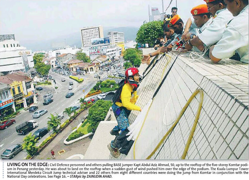 Aziz should have learnt better from the incidents he had as a beginner BASE jumper with insufficient knowledge, skills, or training. He was the first person to get seriously injured crashing into KL Tower, breaking his femur into a few pieces with only about 30 BASE jumps in 2004. A couple of years later, after he recovered, he ended up front page news hung up on the five-story podium at the Komtar building in Penang in 2006. This was again due to his lack of experience and skill. Most people, even without experiencing the accidents Aziz had, would have the foresight to realise that it is a very bad idea to bring people with little or no experience to high-profile BASE jumping events.