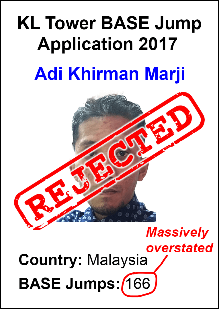 From what I understand, the person now managing KL Tower BASE Jump applications is someone who was rejected from the event just three KL Tower events ago due to his ultralow level of experience and continuing to be dishonest. This person is Adi Khirman Marji or Dewa Dunia on Facebook.