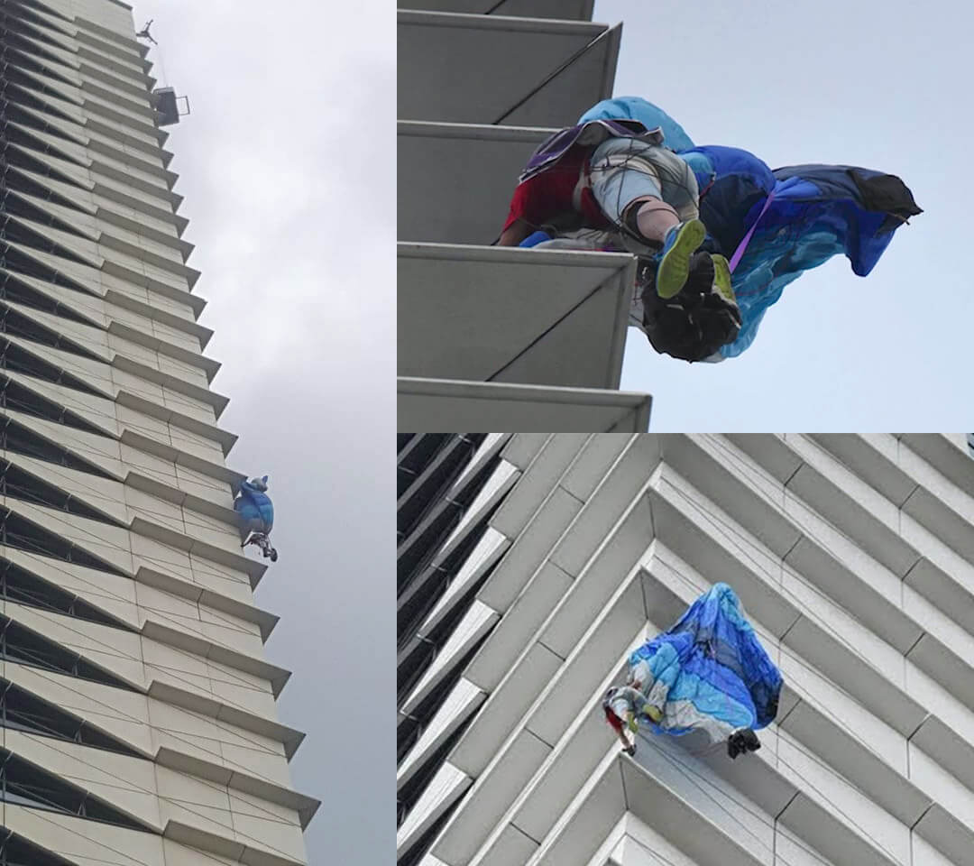 The chaos continued the following year in 2008 when Aziz brought an Indonesian skydiver to the event with no prior BASE jumping experience. He was taken to the highly sensitive Telekom Malaysia headquarters building (aka the Shark Fin building) which we had worked for years to get permission to jump from. The beginner jumped off and turned to face the building, he pitched his pilot chute while facing the building and crashed into the building soon after opening. He continued to crash into the building most of the way down. It greatly contributed to BASE jumping soon being discontinued there. I am sure Telekom Malaysia executives expected a bit more than beginners with practically zero training or experience being taken there to jump.